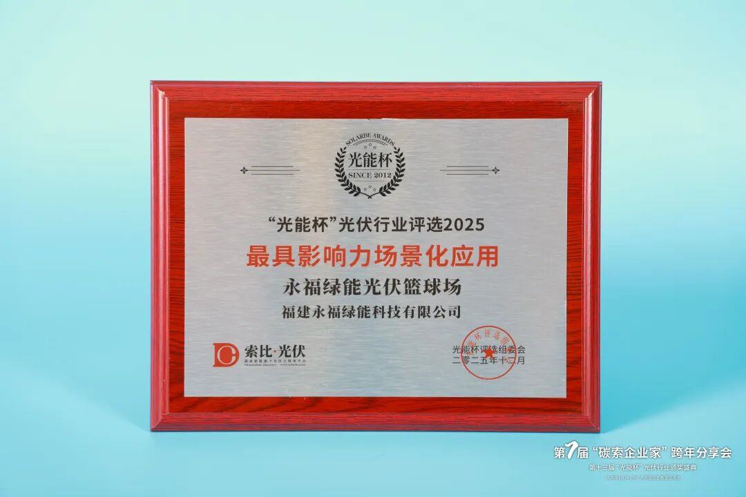1月15日,由索比光伏网主办的第十三届“光能杯”光伏行业颁奖盛典在苏州举行。永福绿能凭借行业首创“彩虹穹顶”光伏篮球场产品,斩获2025年度“最具影响力场景化应用”荣誉。充分体现业界对永福绿能推动光伏与生活场景创新融合成果的高度认可。
